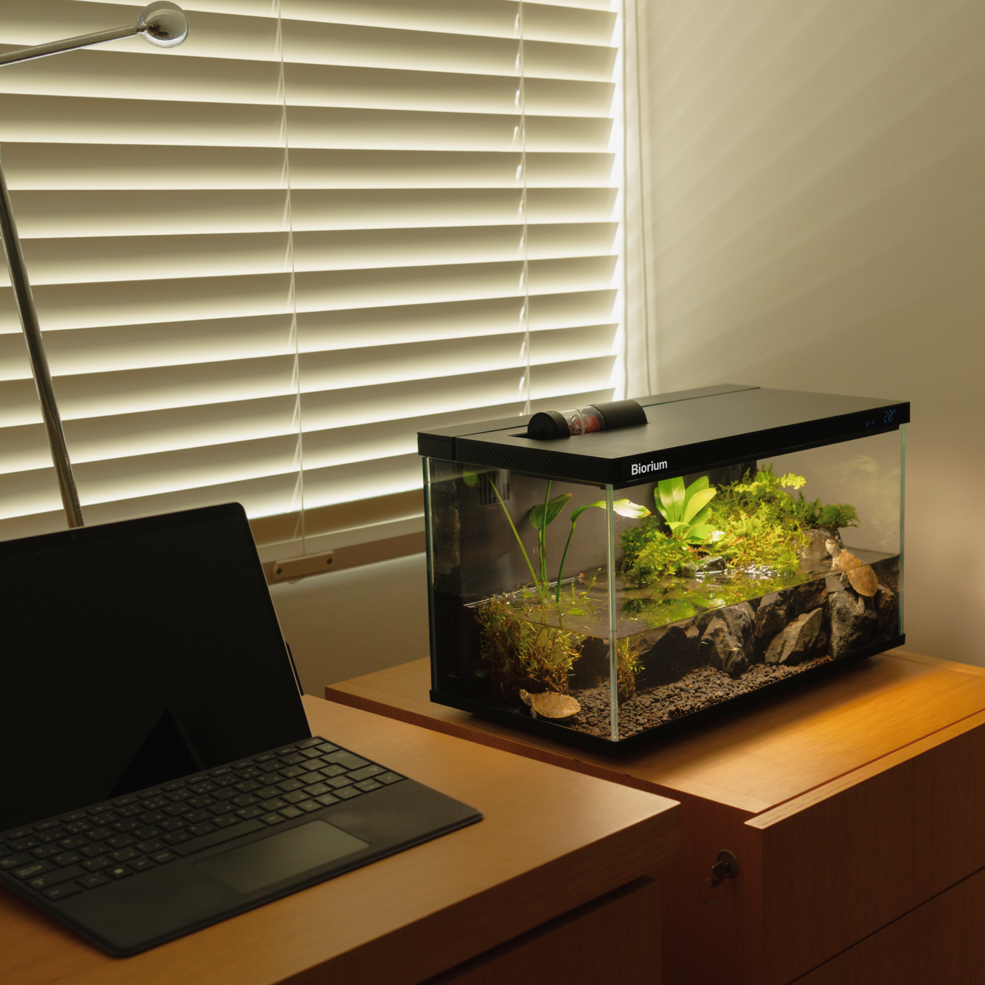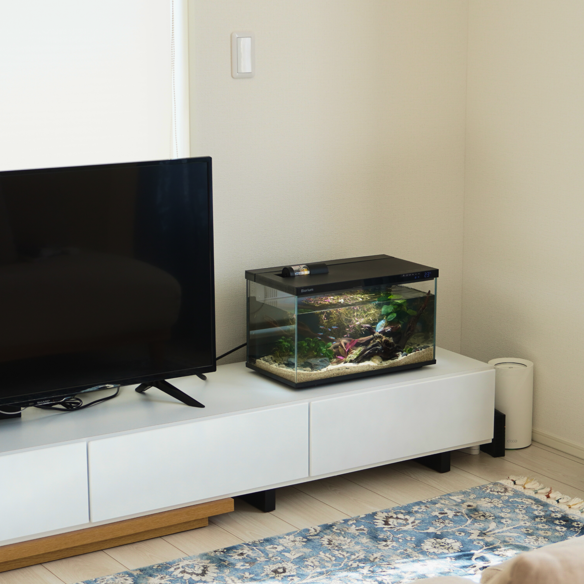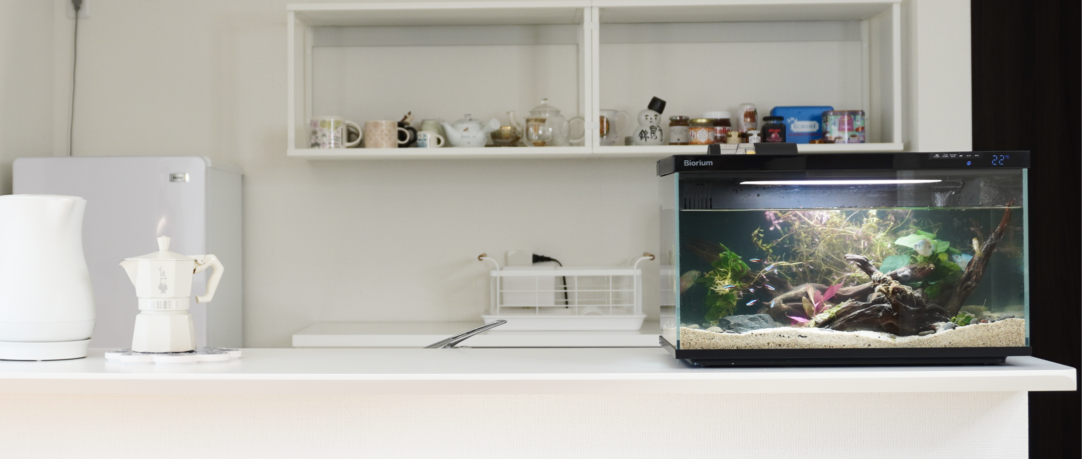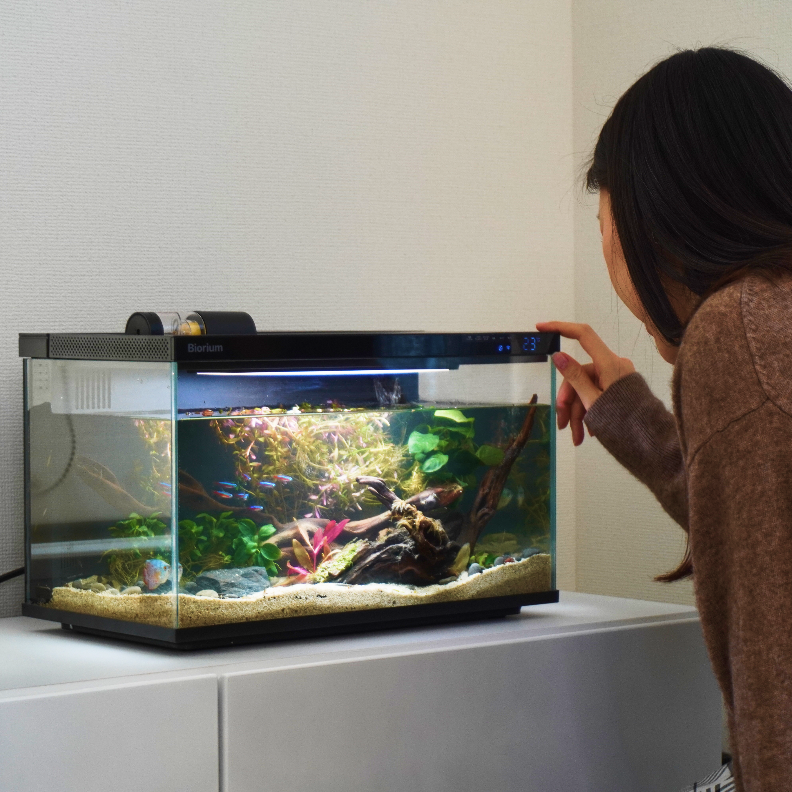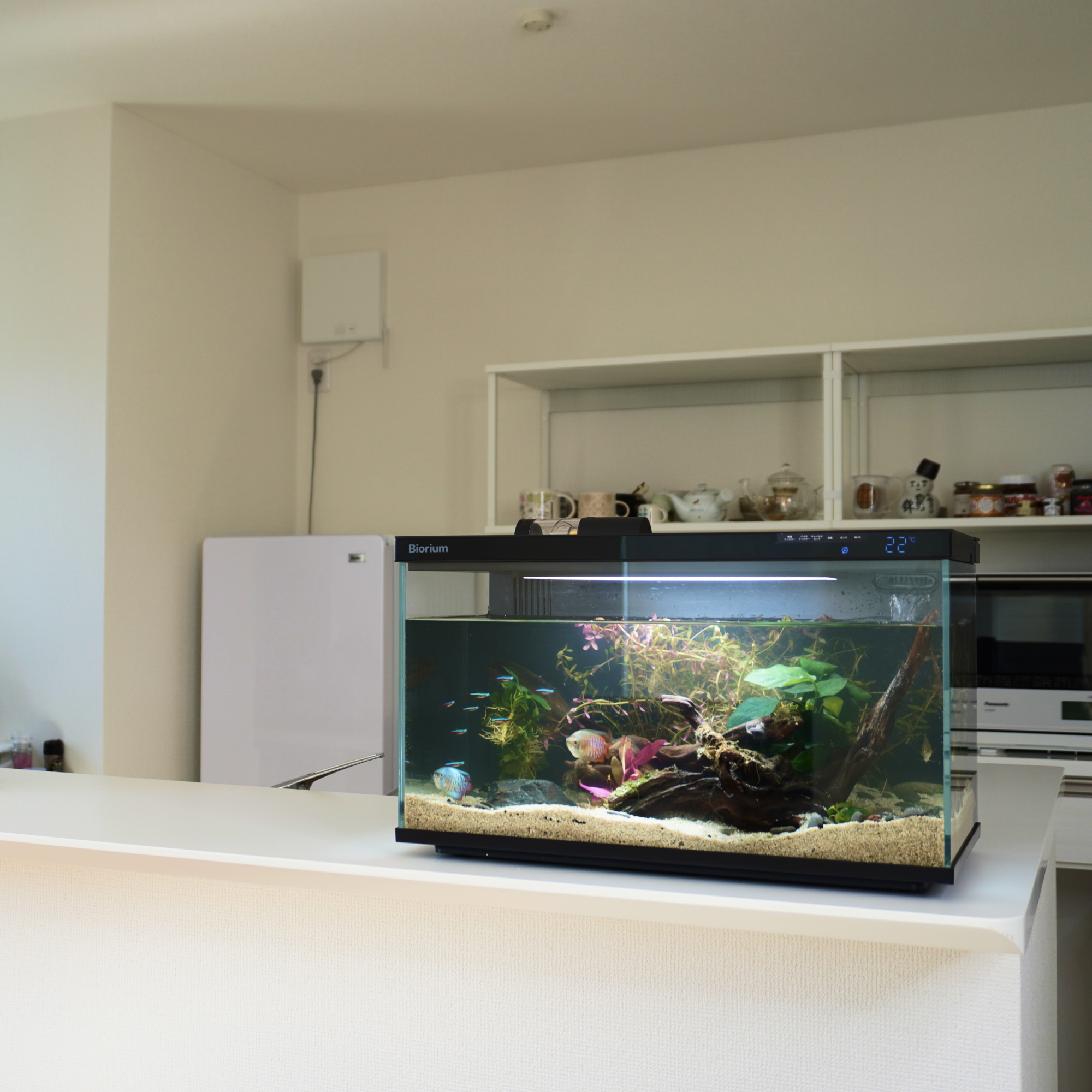 もっとオシャレに水槽を楽しむために、どこでも馴染むようにシンプルなデザインに設計。インテリアとして、空間に溶け込む、新しいアクアリウムのカタチ。